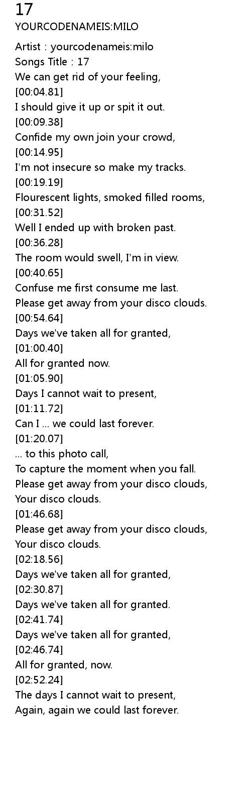 | [00:00.50] | Songs Title: 17 |