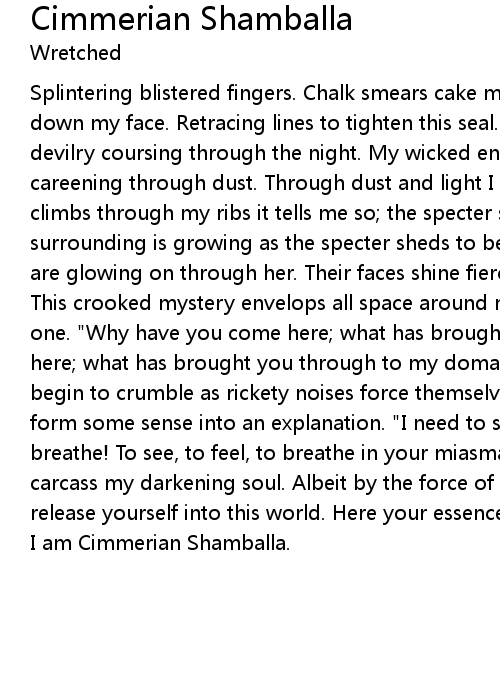 Splintering blistered fingers. Chalk smears cake my body white. Sweat perspiring down my face. Retracing lines to tighten this seal. Clandestinely twining with devilry coursing through the night. My wicked enchantments hurl my body as it's careening through dust. Through dust and light I feel I've made it. As my heart climbs through my ribs it tells me so; the specter shows me so. The darkness surrounding is growing as the specter sheds to begin anew. Within it's body they are glowing on through her. Their faces shine fiercely with such deep sinew. This crooked mystery envelops all space around me as the many faces speak as one. "Why have you come here; what has brought you through? Why have you come here; what has brought you through to my domain!" My body falters. I feel myself begin to crumble as rickety noises force themselves from my throat. I begin to form some sense into an explanation. "I need to see this, to feel this, to breathe! To see, to feel, to breathe in your miasma." "Take refuge in the carcass my darkening soul. Albeit by the force of beauty incarnate, do not release yourself into this world. Here your essence is soluble."