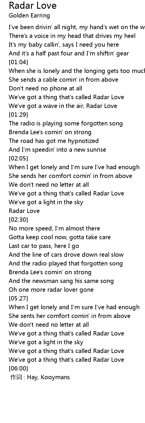 | [05:51] | We' ve got a thing that' s called Radar Love |