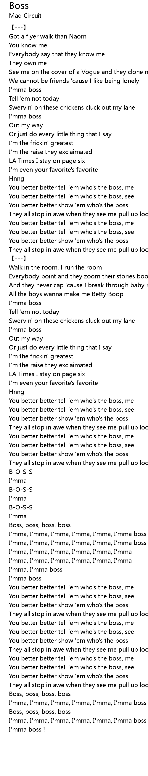 | [02:42.00] | Boss, boss, boss, boss |