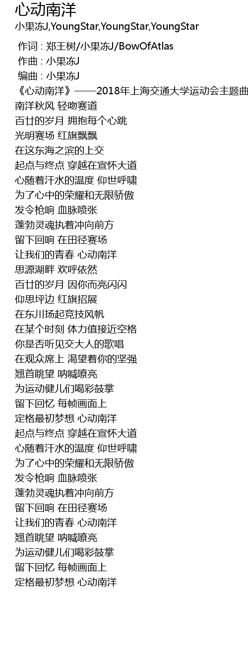 | [00:00.00] | 《心动南洋》——2018年上海交通大学运动会主题曲 |