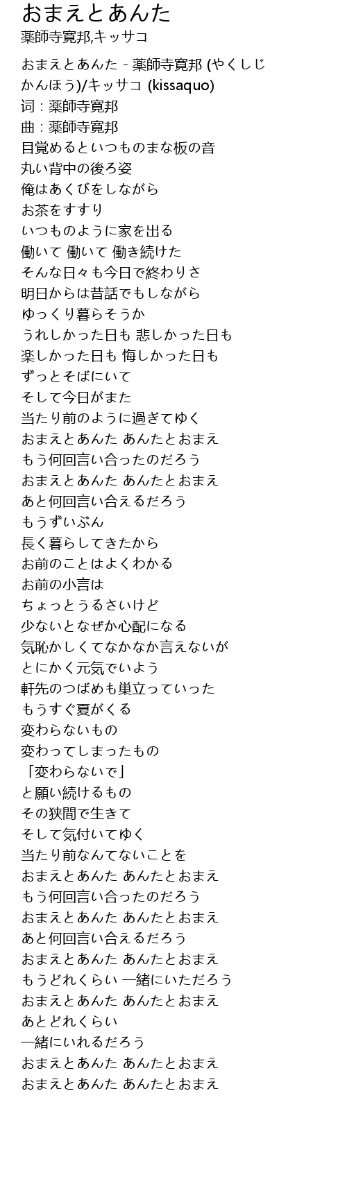 | [00:00.00] | おまえとあんた - 薬師寺寛邦 (やくしじ かんほう)/キッサコ (kissaquo) |