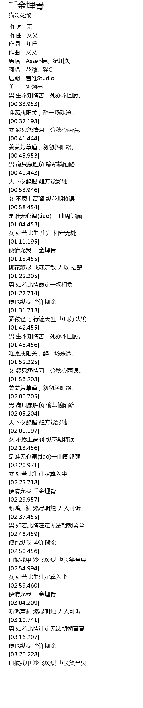 | [03:03.956] | biàn qǐng yǔn wǒ qiān jīn mái gǔ |