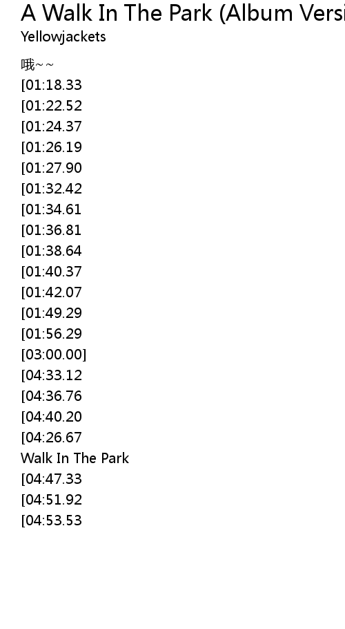 | [04:30.28][04:26.67][03:45.60][02:04.27][05:12.01][04:58.52][04:43.81][04:20.80][04:00.66][02:18.77] | A Walk In The Park |