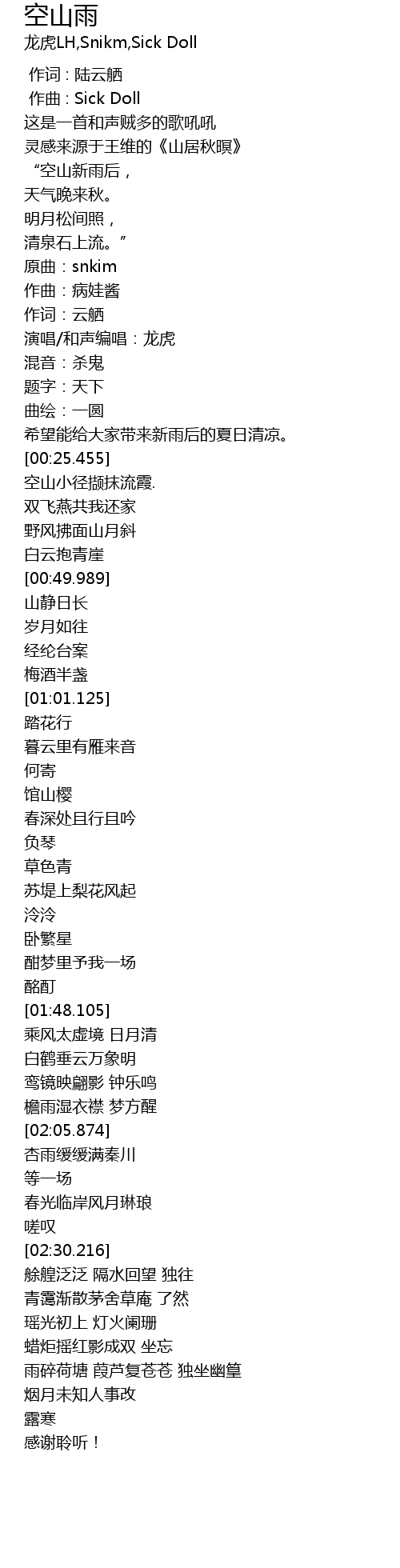 | [00:06.628] | " kōng shān xīn yǔ hòu, |