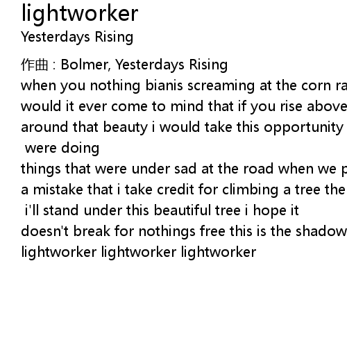 | when you nothing bianis screaming at the corn raise no question but it is soar would it ever come to mind that if you rise above the highest tree falling around that beauty i would take this opportunity do you really wind up a duck enough with enough big ceramic balls slam dunk!! yeahhhhhh [chorus:] were doing things that were under sad at the road when we pushed him for the first time was a mistake that i take credit for climbing a tree the rest is all there working a job wasting a lot more [x2] i'll stand under this beautiful tree i hope it doesn't break for nothings free this is the shadow that i'm not afraid of lightworker lightworker lightworker |