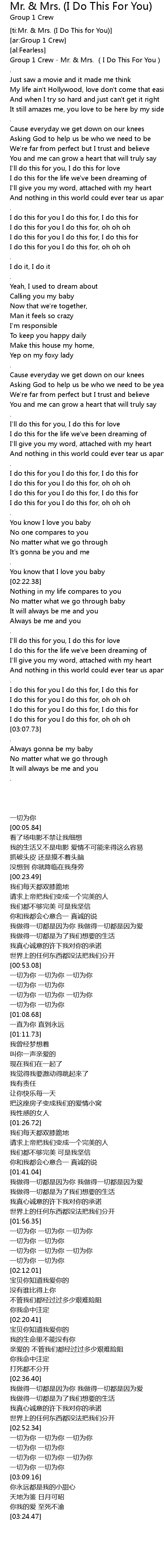 | [00:00.09] | Group 1 Crew - Mr. & Mrs. (I Do This For You) |