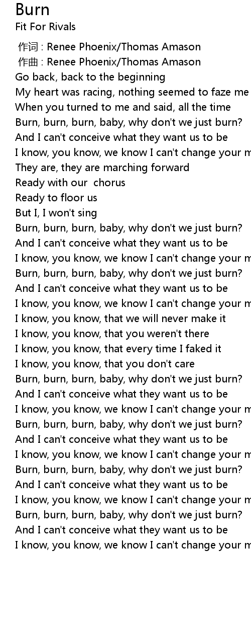 | [00:51.83] | Burn, burn, burn, baby, why don' t we just burn? |