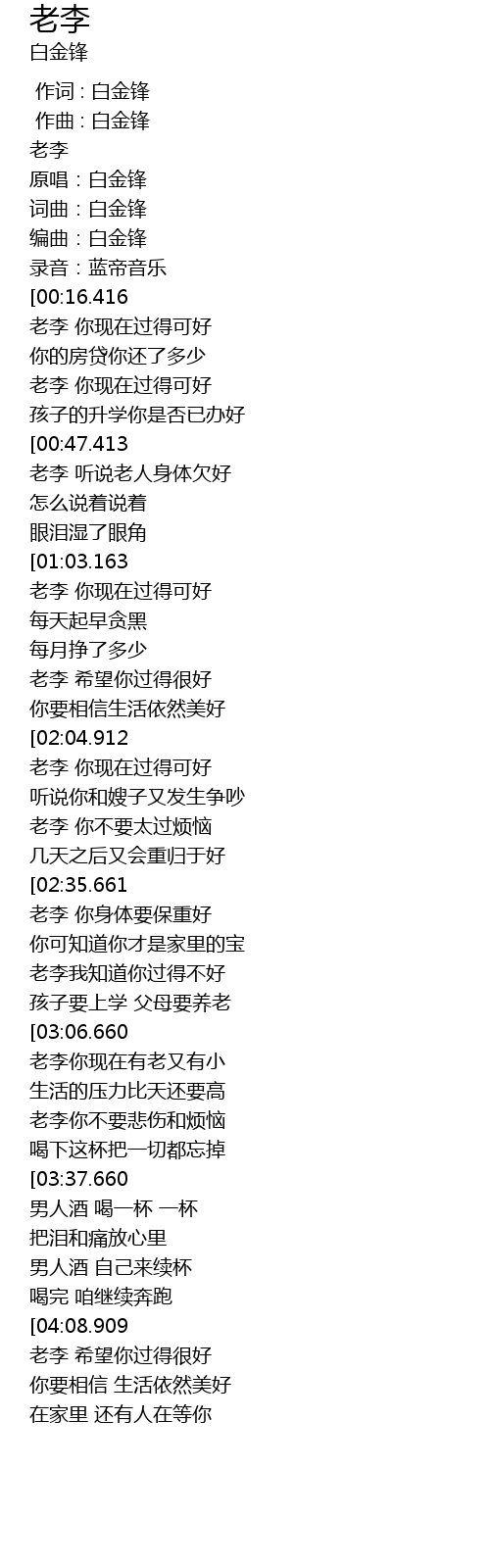 | [01:18.834] | lǎo lǐ xī wàng nǐ guò de hěn hǎo |