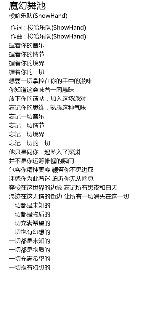 | [00:00.000] | 作词 : 梭哈乐队(ShowHand) |