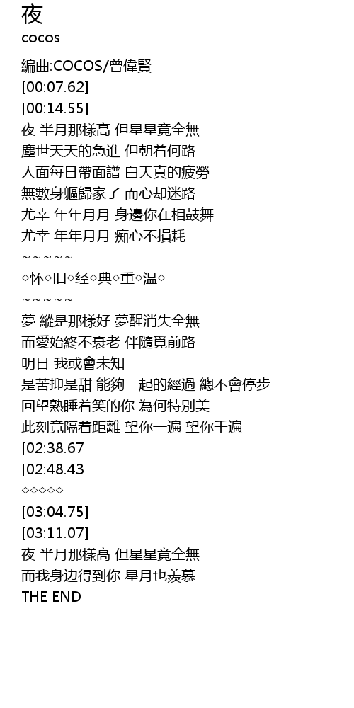 | [00:04.71] | 編曲:COCOS/曾偉賢 |