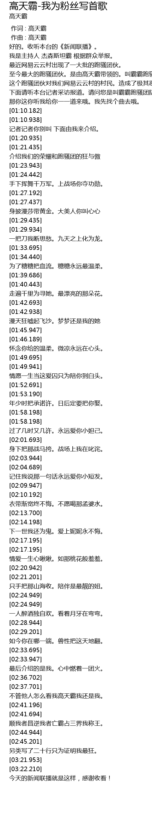| [00:27.183] | 至今最大的跑骚团伙。是由高天霸带领的。叫霸霸跑骚团伙 这个跑骚团伙对我们网易云云村的村民。造成了极其恶劣的影响。 |