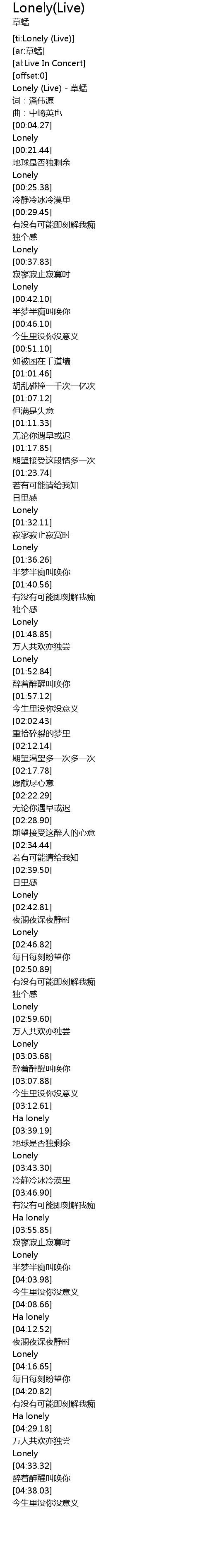 | [00:00.30] | Lonely (Live) - 草蜢 |