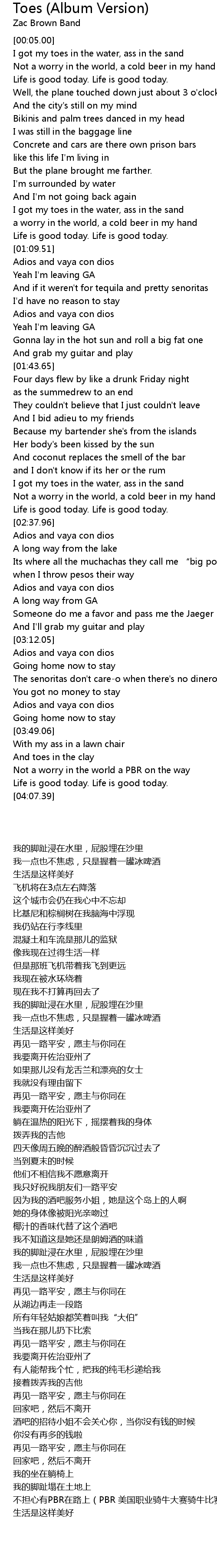 | [00:57.39] | I got my toes in the water, ass in the sand |