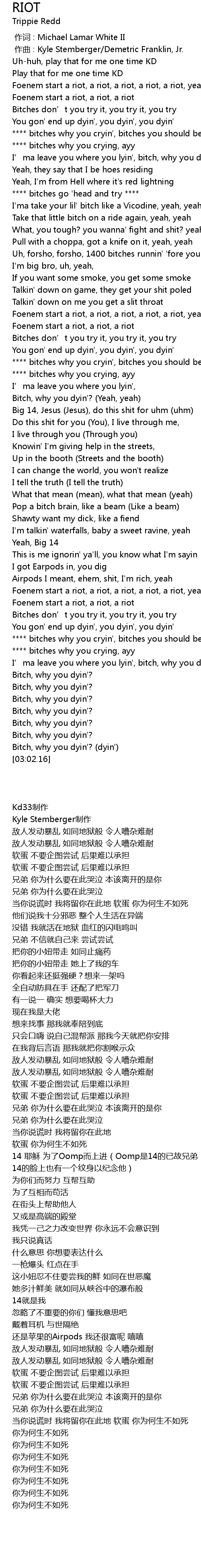 | [02:43.45] | I’ma leave you where you lyin', bitch, why you dyin'?(dyin') |