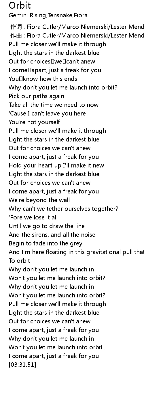 | [01:56.22] | And I' m here floating in this gravitational pull that I can' t shake |
