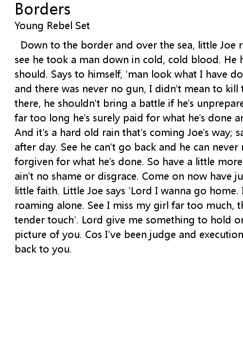 Down to the border and over the sea, little Joe runs for his need to be free see he took a man down in cold, cold blood. He hit him harder than he probably should. Says to himself, 'man look what I have done. I didn't pull no trigger and there was never no gun, I didn't mean to kill the guy he was just standing there, he shouldn't bring a battle if he's unprepared'. Cos he's been down for far too long he's surely paid for what he's done and now he tries to carry on. And it's a hard old rain that's coming Joe's way; same old routine repeating day after day. See he can't go back and he can never move on until he's been forgiven for what he's done. So have a little more faith, darling you know there ain't no shame or disgrace. Come on now have just a little more faith, have a little faith. Little Joe says 'Lord I wanna go home. I know longer wish to be roaming alone. See I miss my girl far too much, the scent of a woman and her tender touch'. Lord give me something to hold onto like hope on a rope or a picture of you. Cos I've been judge and executioner too, I need to find my way back to you. |