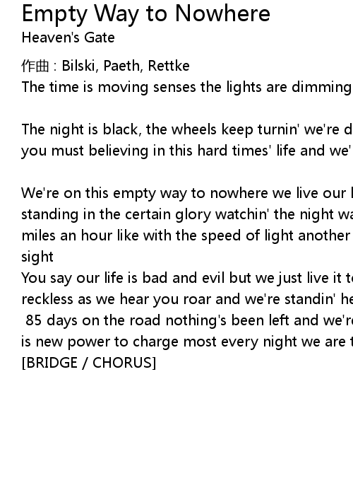 | We' re on this empty way to nowhere we live our life, we love that rock we ' re standing in the certain glory watchin' the night wastin' and fadin' away 1. 000 miles an hour like with the speed of light another place of power is coming into sight | |