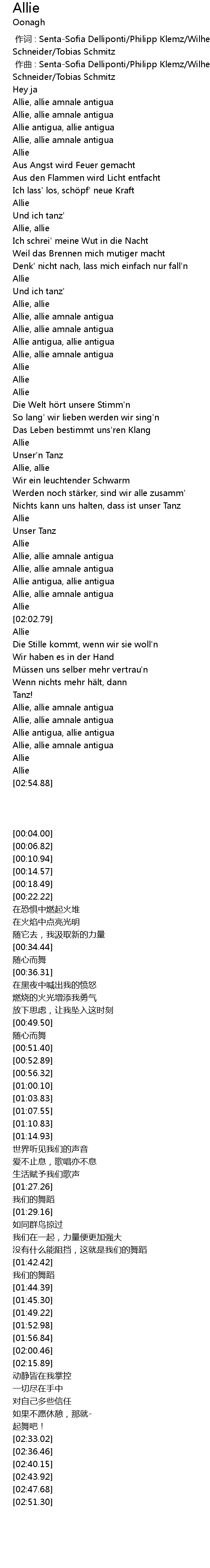 | [01:56.84] | Allie, allie amnale antigua |