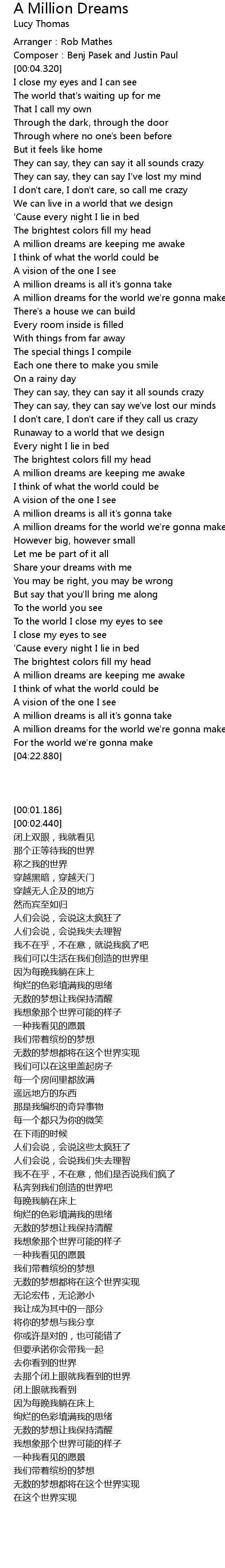 | [04:01.225] | A million dreams for the world we' re gonna make |