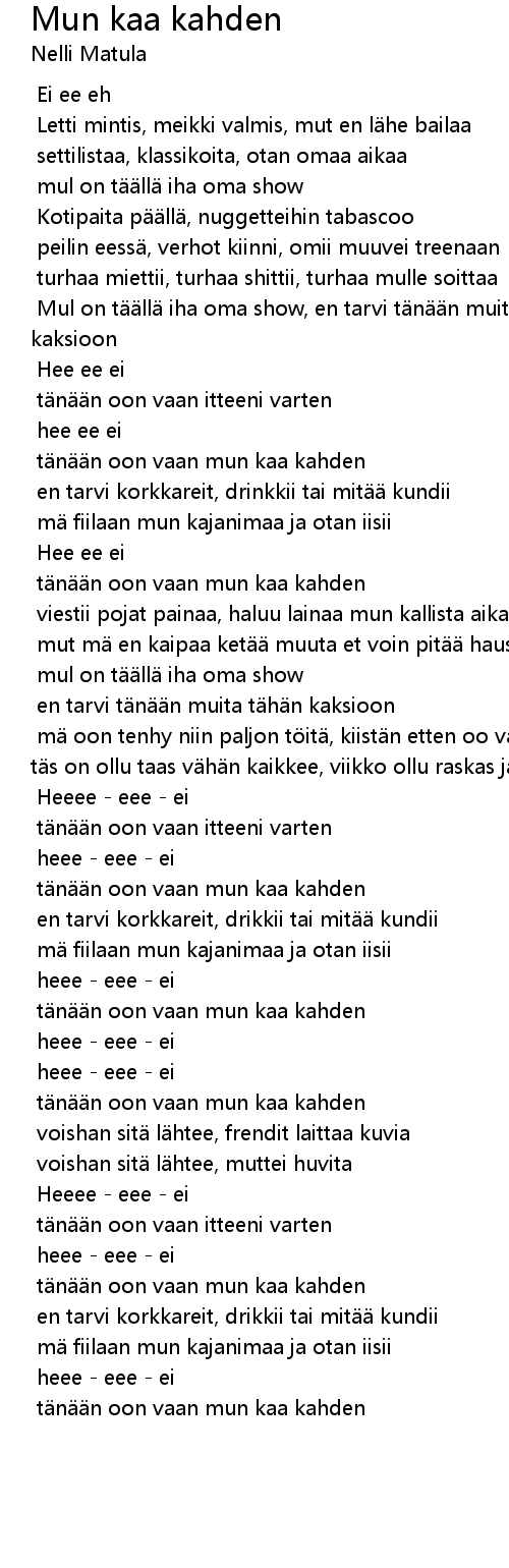 | [02:48.123] | tänään oon vaan mun kaa kahden |