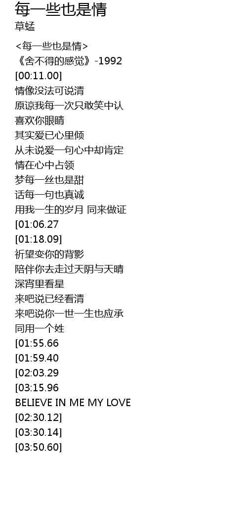 | [03:24.00][03:15.96][03:07.93][02:59.45][02:18.05][02:10.30] | 每一些也是情 |