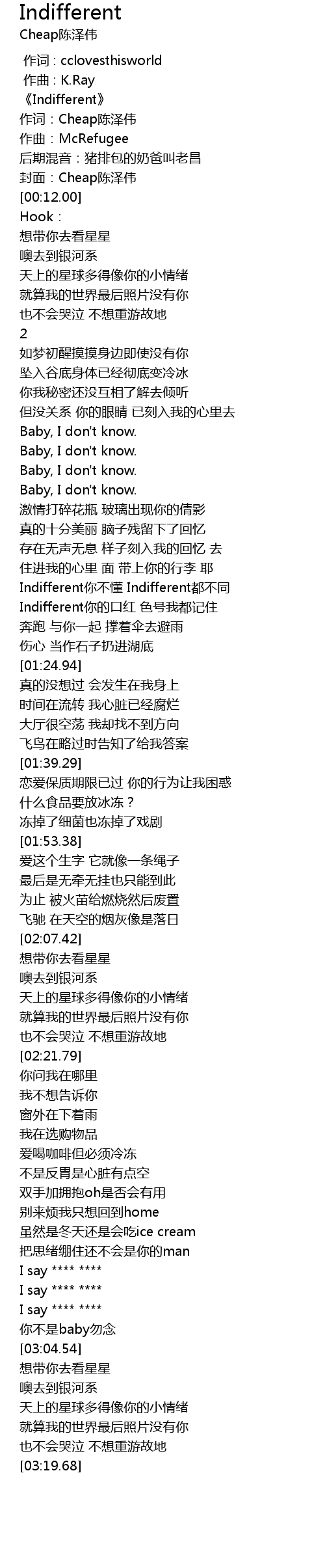 | [01:10.70] | Indifferent你不懂 Indifferent都不同 |