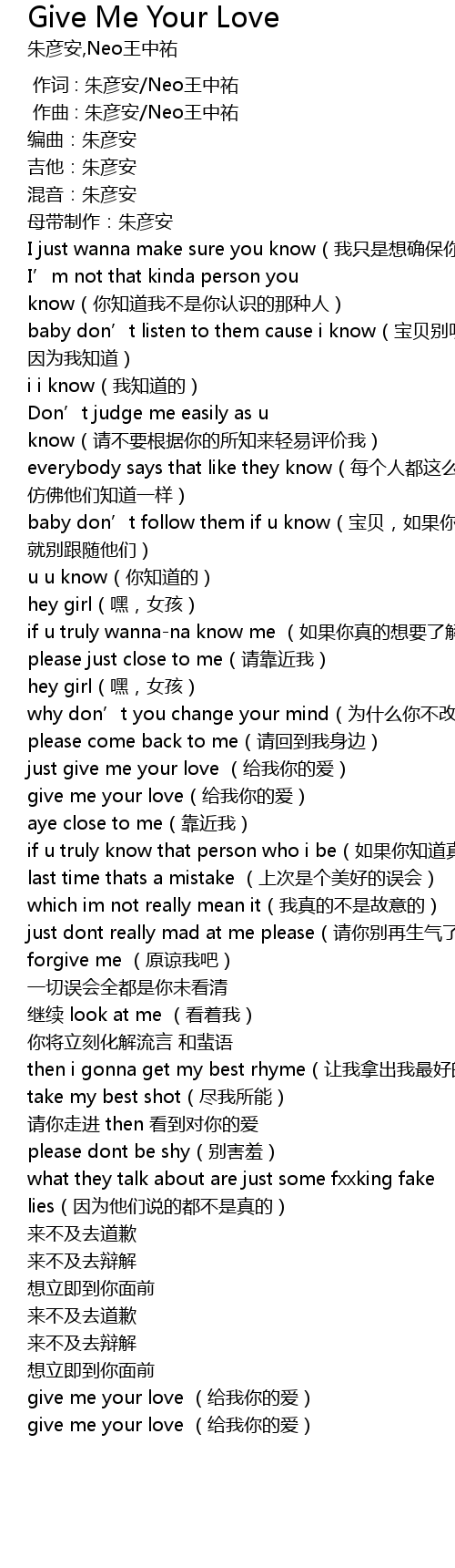 | [01:09.686] | just give me your love gěi wǒ nǐ de ài |