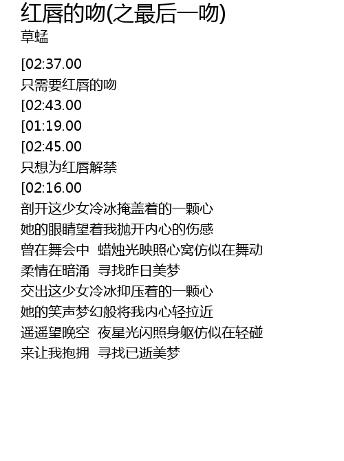 | [02:52.00][02:37.00][02:02.00][01:13.00][00:23.00] | 不需要有原因 只需要红唇的吻 |