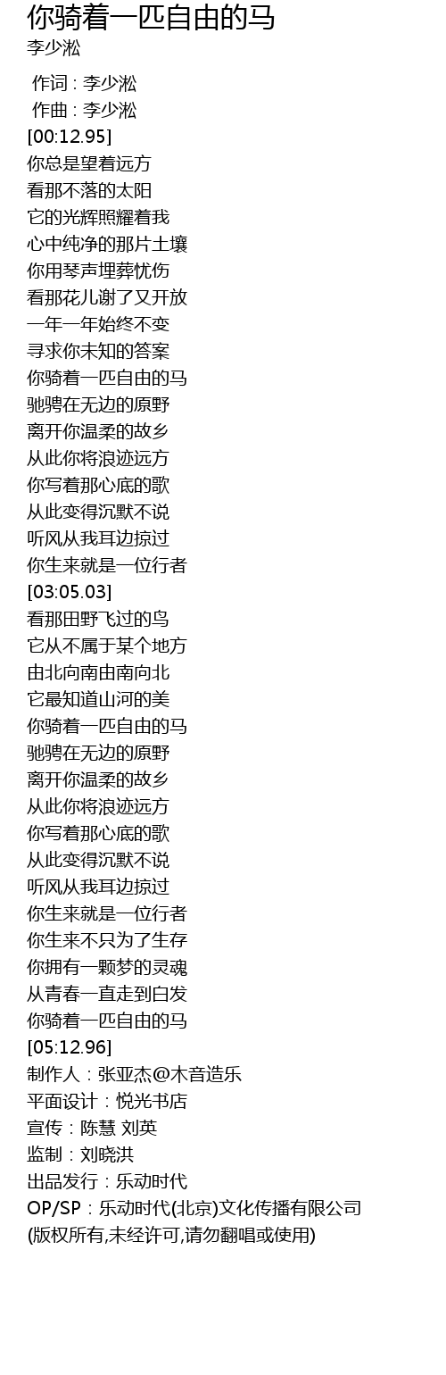 | [02:15.31] | nǐ qí zhe yī pǐ zì yóu de mǎ |