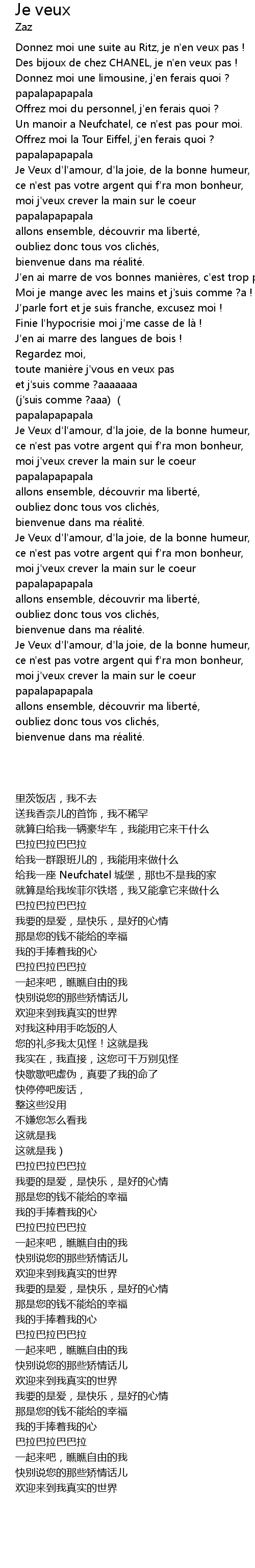 | [00:12.700] | Donnez moi une suite au Ritz, je n' en veux pas ! |
