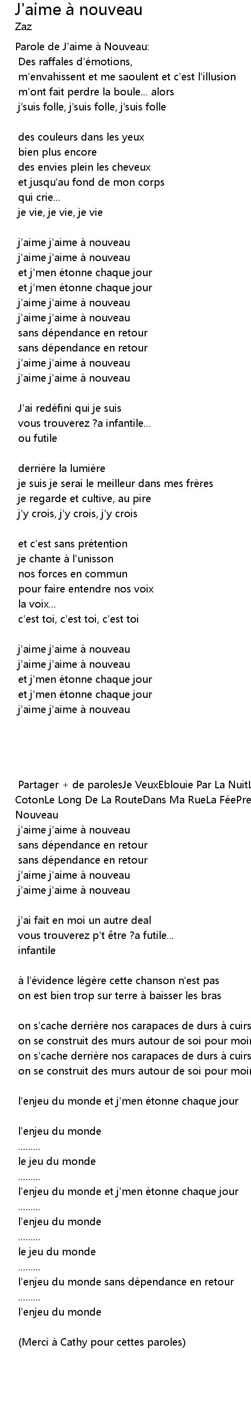 | Partager de parolesJe VeuxEblouie Par La NuitLes PassantsTrop SensiblePort CotonLe Long De La RouteDans Ma RueLa Fé ePrends Garde A Ta LangueJ' Aime A Nouveau | |