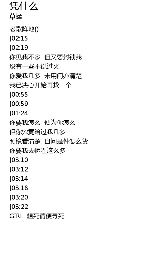 | [03:31][03:14][02:27] | kàn bù qǐ nǐ wèi pèi wǒ pǐn wèi |