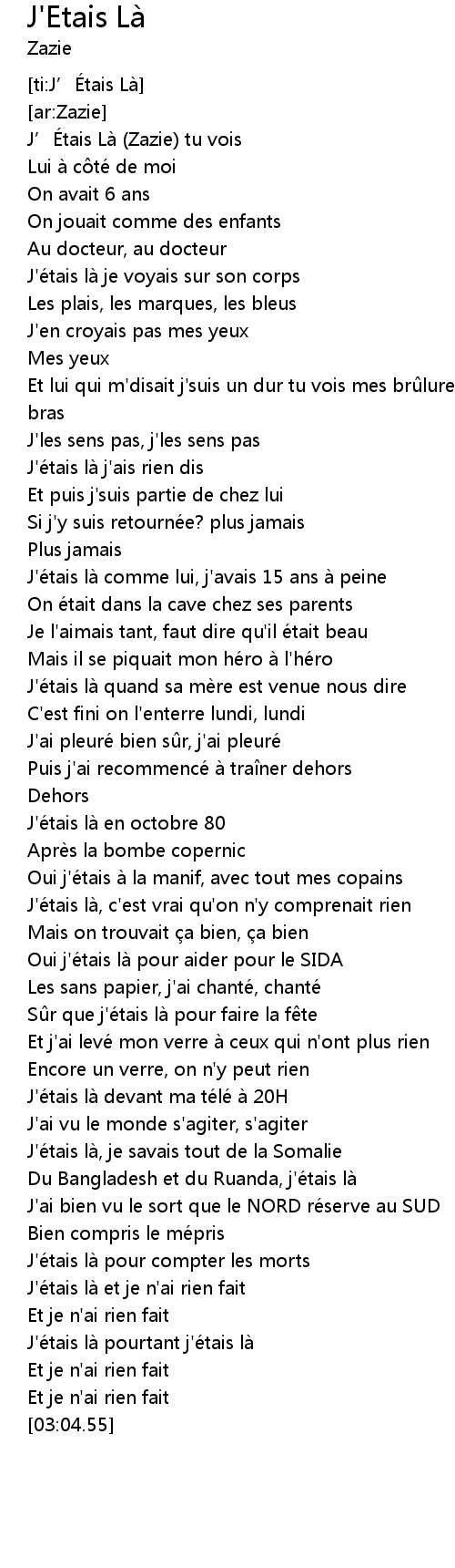 | [00:00.37] | J’Étais Là (Zazie) tu vois |