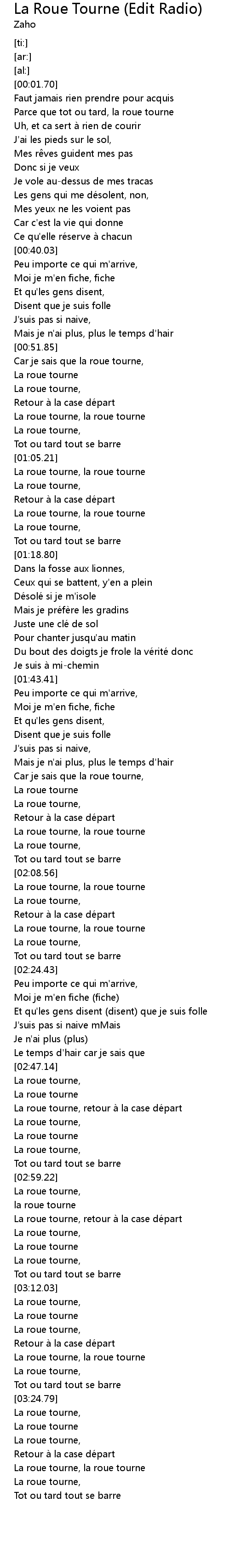 | [00:05.90] | Parce que tot ou tard, la roue tourne |