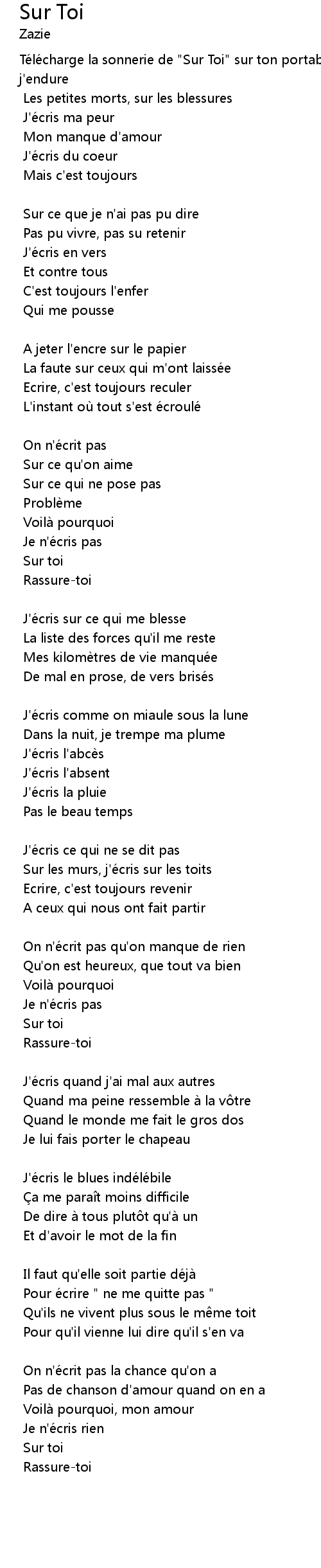 | Té lé charge la sonnerie de " Sur Toi" sur ton portable J'é cris sur ce que j' endure | |