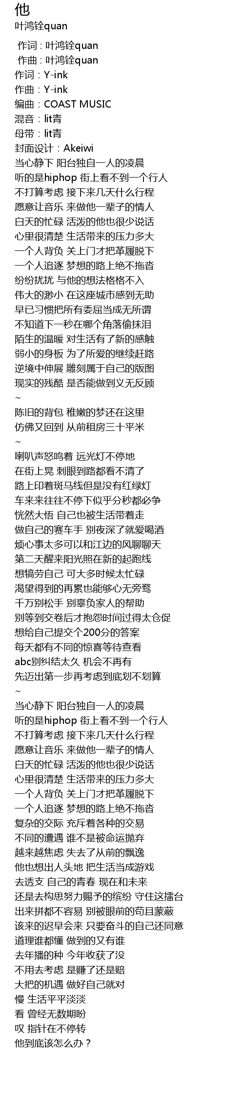 | [00:00.000] | 作词 : 叶鸿铨quan |