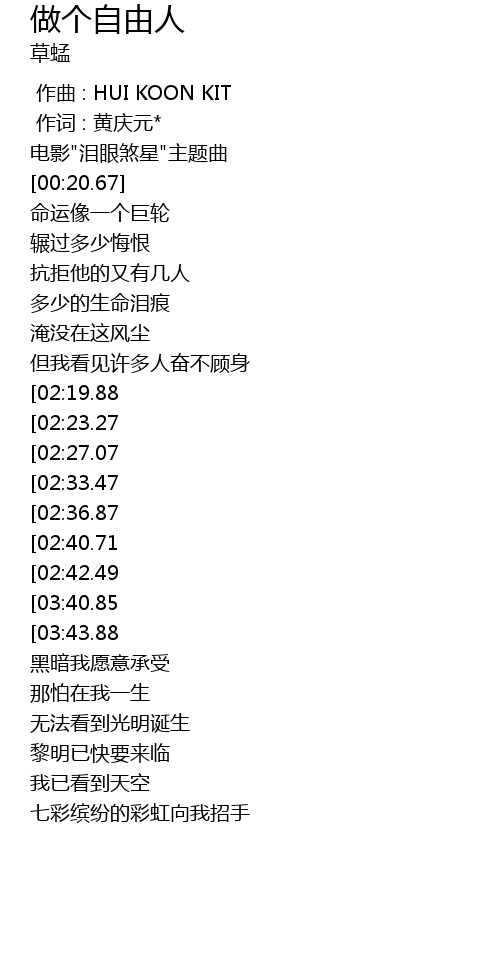 | [03:51.10][03:43.88][01:48.27] | 做个自由人 |