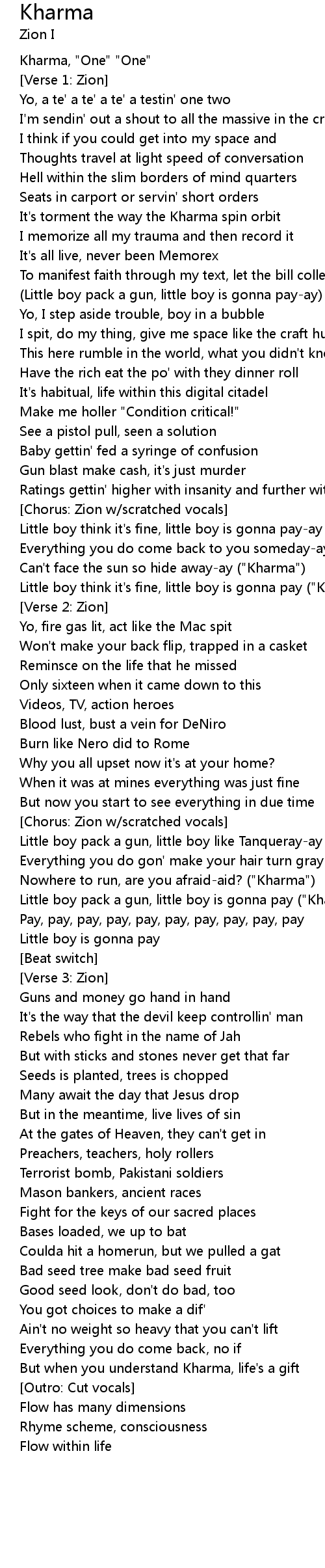 Little boy pack a gun, little boy is gonna pay ("Kharma") |