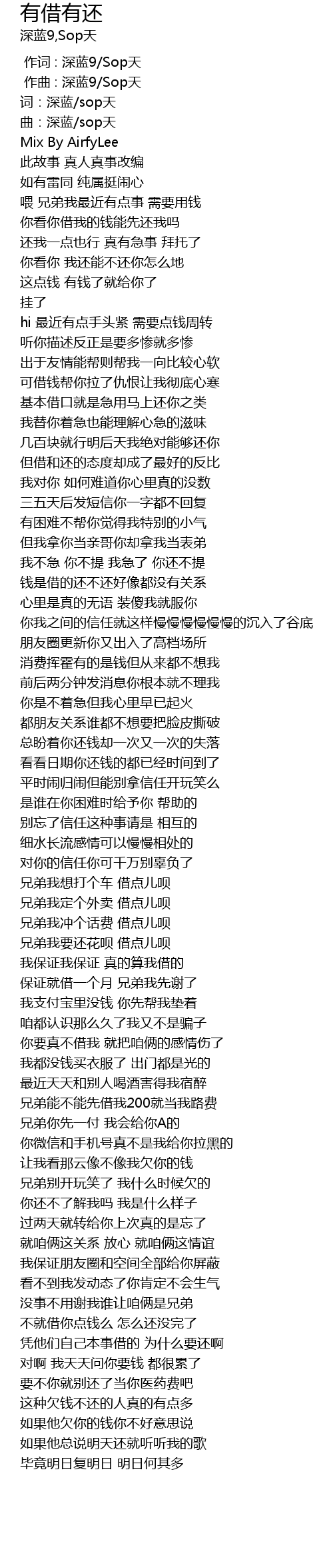 | [01:37.13] | 兄弟我要还花呗 借点儿呗 |