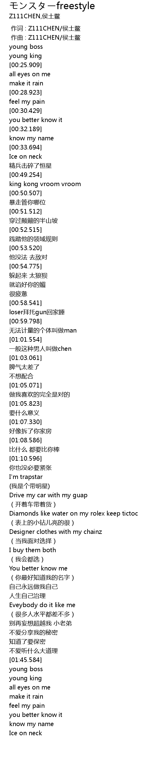 | [01:15.452] | Diamonds like water on my rolex keep tictoc |
