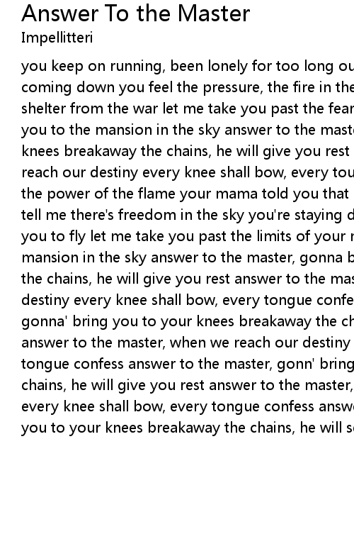 you keep on running, been lonely for too long out on the boulevard, the hammer's coming down you feel the pressure, the fire in the storm you need another way, a shelter from the war let me take you past the fears inside your mind let me take you to the mansion in the sky answer to the master, gonna' bring you to your knees breakaway the chains, he will give you rest answer to the master, when we reach our destiny every knee shall bow, every toungue confess do you remember the power of the flame your mama told you that love will never end you used to tell me there's freedom in the sky you're staying down too long, it's time for you to fly let me take you past the limits of your mind let me take you to the mansion in the sky answer to the master, gonna bring you to your knees breakaway the chains, he will give you rest answer to the master, when we reach our destiny every knee shall bow, every tongue confess (solo) answer to the master, gonna' bring you to your knees breakaway the chains, he will give you rest answer to the master, when we reach our destiny every knee shall bow, every tongue confess answer to the master, gonn' bring you to your knees breakaway the chains, he will give you rest answer to the master, when we reach our destiny every knee shall bow, every tongue confess answer to the master, gonna' bring you to your knees breakaway the chains, he will set you free |