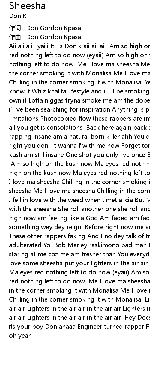 | Aii aii aii Eyaiii It’s Don k aii aii aii Am so high on the kush now Ma eyes red nothing left to do now (eyaii) Am so high on the kush now Ma eyes red nothing left to do now Me I love ma sheesha Me I love ma sheesha Chilling in the corner smoking it with Monalisa Me I love ma sheesha Me I love ma sheesha Chilling in the corner smoking it with Monalisa Yeah you know it oh yeah you know it Whiz khalifa lifestyle and i’ll be smoking We control it oh yeah we own it Lotta niggas tryna smoke me am the dopest Ahh chilling here all day i’ve been searching for inspiration Anything is possible there is no limitations Photocopied flow these rappers are imitations I just keep on winning all you get is consolations Back here again back and am more sicker Mehn am rapping insane am a natural born killer ahh You don’t wanna F with me now Damn right you don’t wanna f with me now Forget tomorrow live today Without the kush am still insane One shot you only live once But i’ll live forever DGK ahh Am so high on the kush now Ma eyes red nothing left to do now (eyaii) Am so high on the kush now Ma eyes red nothing left to do now Me I love ma sheesha Me I love ma sheesha Chilling in the corner smoking it with Monalisa Me I love ma sheesha Me I love ma sheesha Chilling in the corner smoking it with Monalisa Yo I fell in love with the weed when I met alicia But Monalisa gat me so obsessive with the sheesha She roll another one she roll another one Now she got me so high now am feeling like a God Am faded am faded oh Goddamn Am faded Like something wey dey reign. Before right now me am faded You faking you faking These other rappers faking And I no dey talk of triple X when I say you’re adulterated Yo Bob Marley raskimono bad man Fella man Your girl can’t stop staring at me coz me am fresher than You everyday dem love everywhere So if you love some sheesha put your lighters in the air air Am so high on the kush now Ma eyes red nothing left to do now (eyaii) Am so high on the kush now Ma eyes red nothing left to do now Me I love ma sheesha Me I love ma sheesha Chilling in the corner smoking it with Monalisa Me I love ma sheesha Me I love ma sheesha Chilling in the corner smoking it with Monalisa Lighters in the air air in the air air Lighters in the air air in the air air Lighters in the air air in the air air Lighters in the air air in the air air Hey Docside on the mix oh na ha its your boy Don ahaaa Engineer turned rapper Flatmatez forever with ma niggas oh yeah |