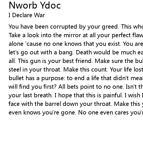 You have been corrupted by your greed. This whole idea of life makes you sick. Take a look into the mirror at all your perfect flaws. You will face this world alone 'cause no one knows that you exist. You are dead to all around you. So let's go out with a bang. Death would be much easier. End your life and spare us all. This gun is your best friend. Make sure the bullet hits its mark. Taste the steel in your throat. Make this count. Your life lost hope long ago. Now this bullet has a purpose: to end a life that didn't mean anything. Who do you think will find you first? All bets point to no one. Isn't that a sad reality? This is your last breath. I hope that this is painful. I wish I could have seen your face with the barrel down your throat. Make this your favorite memory. No one even knows you're gone. No one even cares you're gone. |
