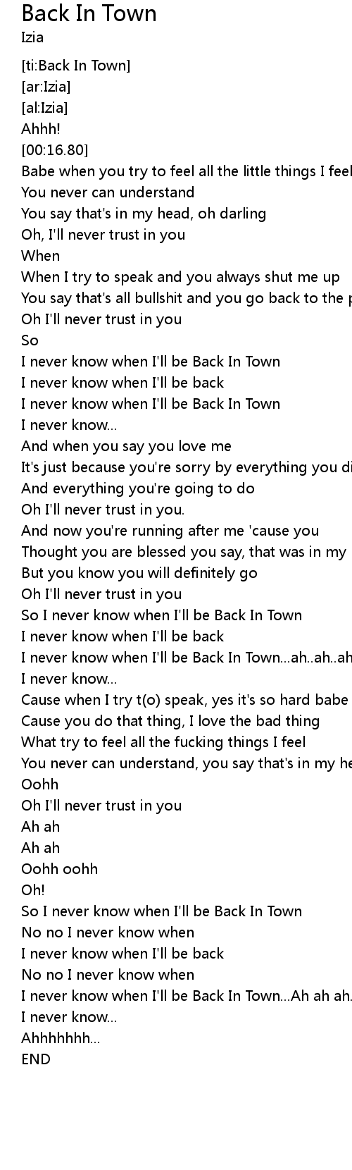 [02:03.33] I never know when I'll be Back In Town...ah..ah..ah