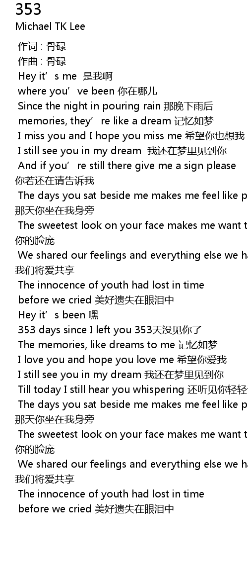 | [01:19.107] | 353 days since I left you 353 tian mei jian ni le |