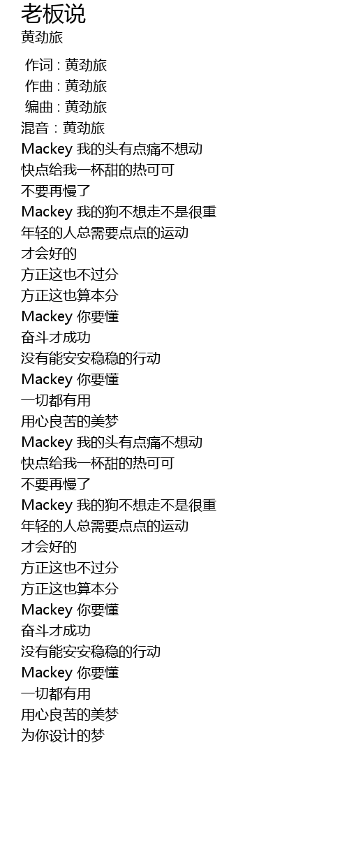 | [00:20.510] | Mackey wǒ de tóu yǒu diǎn tòng bù xiǎng dòng |