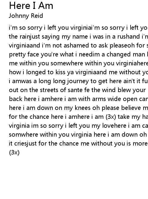 i'm so sorry i left you virginiai'm so sorry i left you my lovecrying there in the rainjust saying my name i was in a rushand i'm asking forgiveness virginiaand i'm not ashamed to ask pleaseoh for so many days i missed you're pretty face you're what i needim a changed man here i amhere i am can you find me within you somewhere within you virginiahere i am do you know how i missed ya how i longed to kiss ya virginiaand me without you is more than i can stand here i amwas a long long journey to get here ain't it funny how the truth it comes out on the streets of sante fe the wind blew your mind out loudso i heard it back here i amhere i am with arms wide open came all this way home back virginia here i am down on my knees oh please believe me virginia my heart it cries just for the chance here i amhere i am (3x) take my handim so sorry i left you virginia im so sorry i left you my lovehere i am can you find me within you somwhere within you virginia here i am down oh you plz believe virginia my heart it criesjust for the chance me without you is more than i can standhere i am (3x)