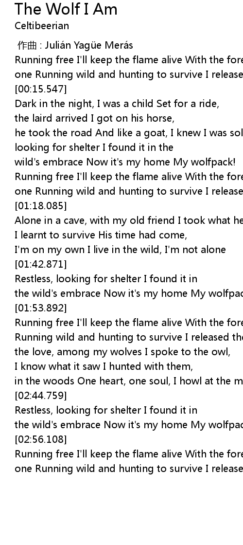 | [00:59.514] | wild's embrace Now it's my home My wolfpack! |