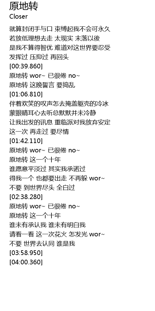 | [00:40.610] | 原地转 wor~ 已很倦 no~ |